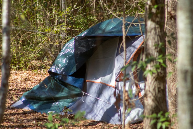 While the count was underway, Moyer was using a donated space heater to warm his tent in the woods. His encampment, nestled in a thicket near a small shopping plaza off U.S. 1, is powered by donated propane tanks.